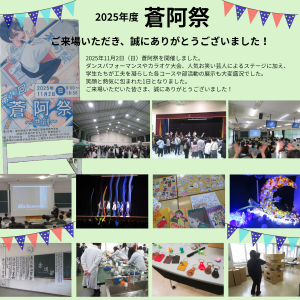 学生会はまた,各種の諸行事を自ら企画・実施します。高専祭の運営は蒼阿祭執行委員会が中心となり,校内の体育祭に関しては体育委員会が活躍します。これらの行事では,皆さん自身の主体的で,かつ全員による組織的な参画が求められます。