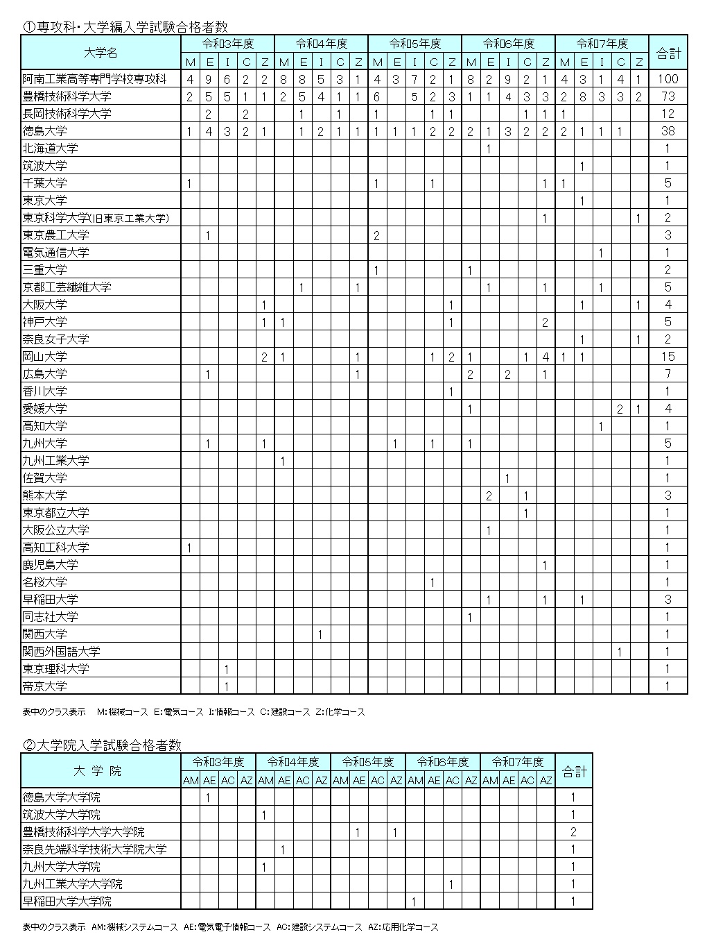 一方で、進学では、国立大学に編入する学生がほとんどで、近隣では徳島大学や岡山大学に編入する学生が多く、高専に特化した大学である豊橋技術科学大学や長岡技術科学大学に編入する学生も多数います。最近では専攻科に進学し、その後国立大学大学院に進学する学生もいます。