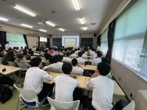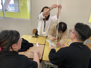 一行は校長との懇談の後、津乃峰神社を見学し、機械コース2年生との英語の共同授業に参加、続いて4人ずつのグループに分かれてタワーの高さを競うペーパータワー作成のワークショップを体験しました。