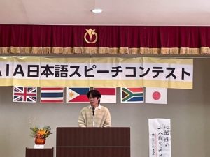 2025年12月7日(日)、富岡公民館において阿南市国際交流協会主催の「第8回日本語スピーチコンテスト」があり、阿南市内在住の外国人7名が日本語でスピーチを行いました。本校からは専攻科応用科学コース2年生のブックさんと化学コース4年生のアーウーさんの2名(いずれもタイからの留学生)が出場しました。