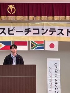2025年12月7日(日)、富岡公民館において阿南市国際交流協会主催の「第8回日本語スピーチコンテスト」があり、阿南市内在住の外国人7名が日本語でスピーチを行いました。本校からは専攻科応用科学コース2年生のブックさんと化学コース4年生のアーウーさんの2名(いずれもタイからの留学生)が出場しました。