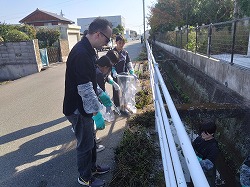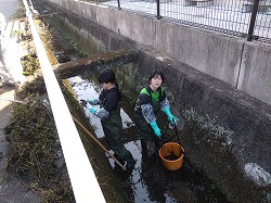 清掃活動に参加した学生たちは、胴付水中長靴を着用し用水路内に入っての清掃作業と、用水路周辺の清掃に分かれて作業にあたりました。