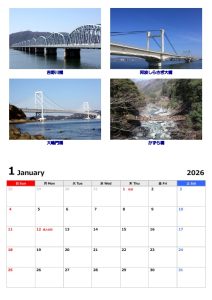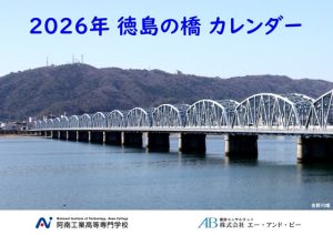 今年も徳島の橋の写真を掲載したカレンダーを、株式会社 エー・アンド・ビー(阿南工業高等専門学校科学技術振興会 企業会員)のご協力により製作しました。今年のカレンダーは、先日実施した「徳島の橋かるた 48橋 選抜総選挙」(TBK48)において、上位となった48橋を掲載したもので、毎月、県内の橋が4つずつ掲載されています。