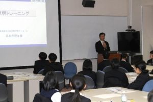 講演では豊栖弁理士から発明や特許に関する概要についてのお話をお伺いし、特許取得条件である「新規性」と「進歩性」、特許取得までの流れについてもわかりやすくご説明いただきました。演習では岸本弁理士から鉛筆を題材にした発明に関する簡単な講義の後、西本弁理士、丹生弁理士、上田弁理士、阿出川弁理士が「歩きスマホを防止する発明」について4人1グループで話し合い、まとめたアイデアの発表を行う、発明トレーニング(演習)を実施しました。