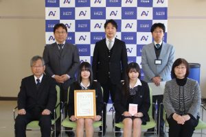 最後に、大和田校長、湯城副会長、釜野地域連携・テクノセンター長、香西地域連携部門長、学生指導にあたった藤原准教授、そして代表学生2名による記念写真撮影を行いました。