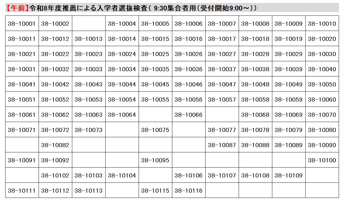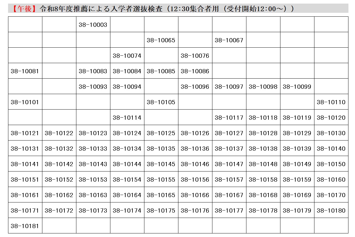 受験生においては,必ず以下の【集合時間別の受験番号表】から自身の受験番号を確認し,集合する時間(午前・午後)にあわせた「令和8年度阿南工業高等専門学校推薦による入学者選抜検査受験者心得」を必ず確認し,集合時間,集合場所等を間違わないようご参集願います。